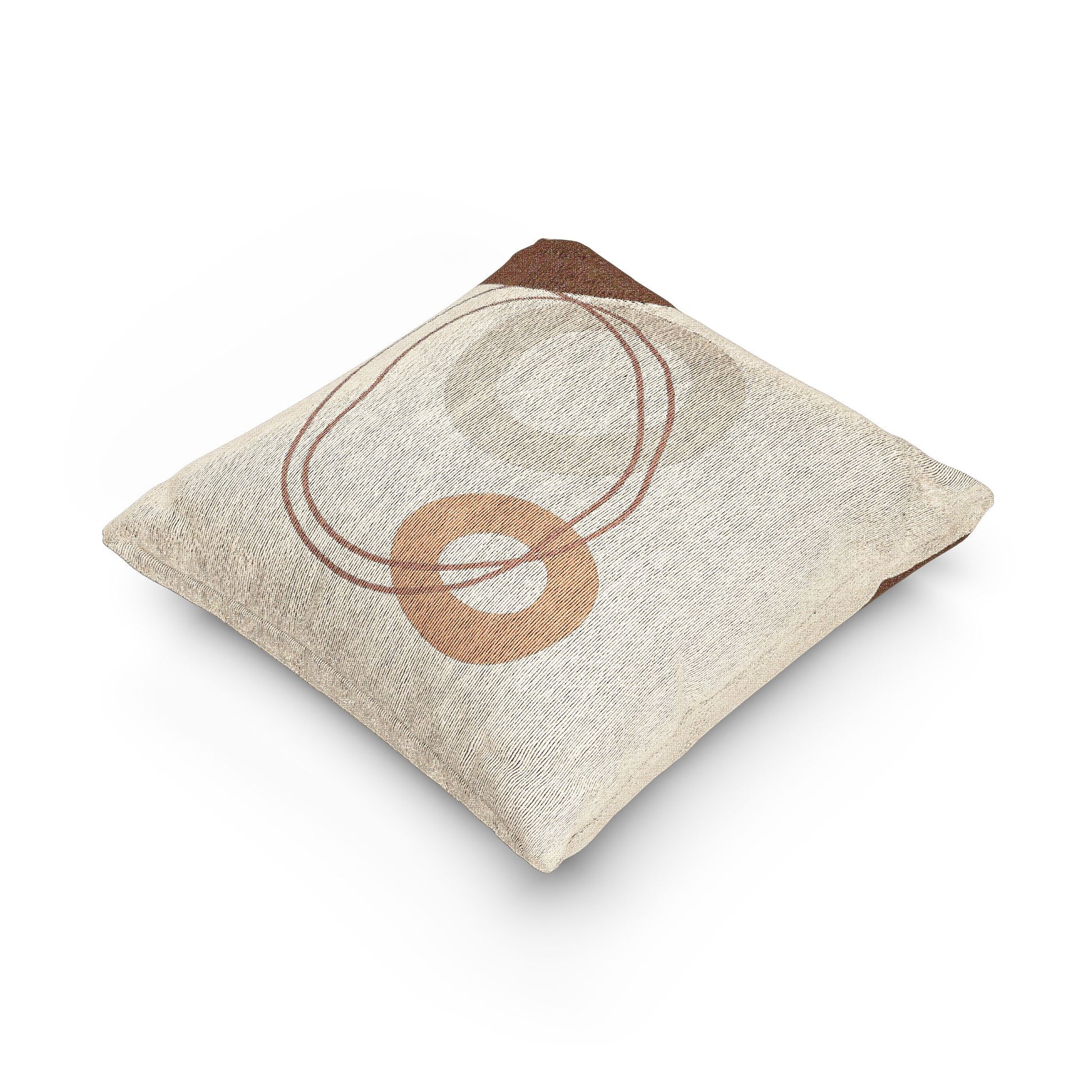 Bring movement and modern elegance to your space with this abstract orbit throw pillow, featuring a dynamic interplay of circles and looping lines. A large brown circle anchors the top left, while a central beige circle and a smaller mustard yellow accent create visual balance. Two reddish-brown wavy lines weave through the composition, intersecting with a soft beige ring to evoke a sense of orbit and flow.