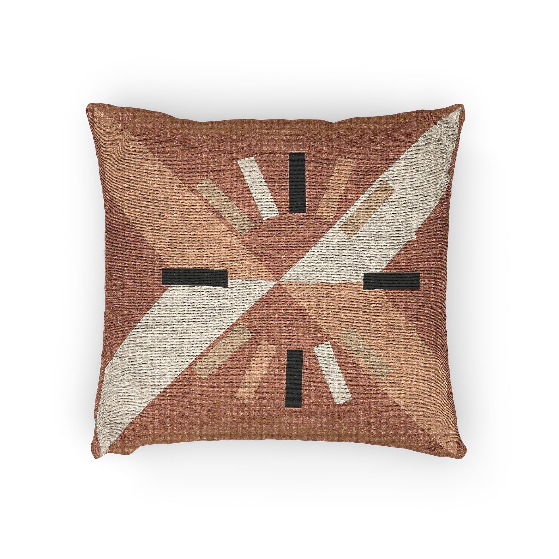 Boldly centered and cleanly composed, this pillow evokes balance in motion. At its heart, an “X” shape radiates outward in warm tones of beige and orange, forming a compass of quiet energy. Encircling the center, rectangular forms in earthy hues echo rhythm and repetition—black, sienna, and sandy brown—each a beat in a visual cadence.