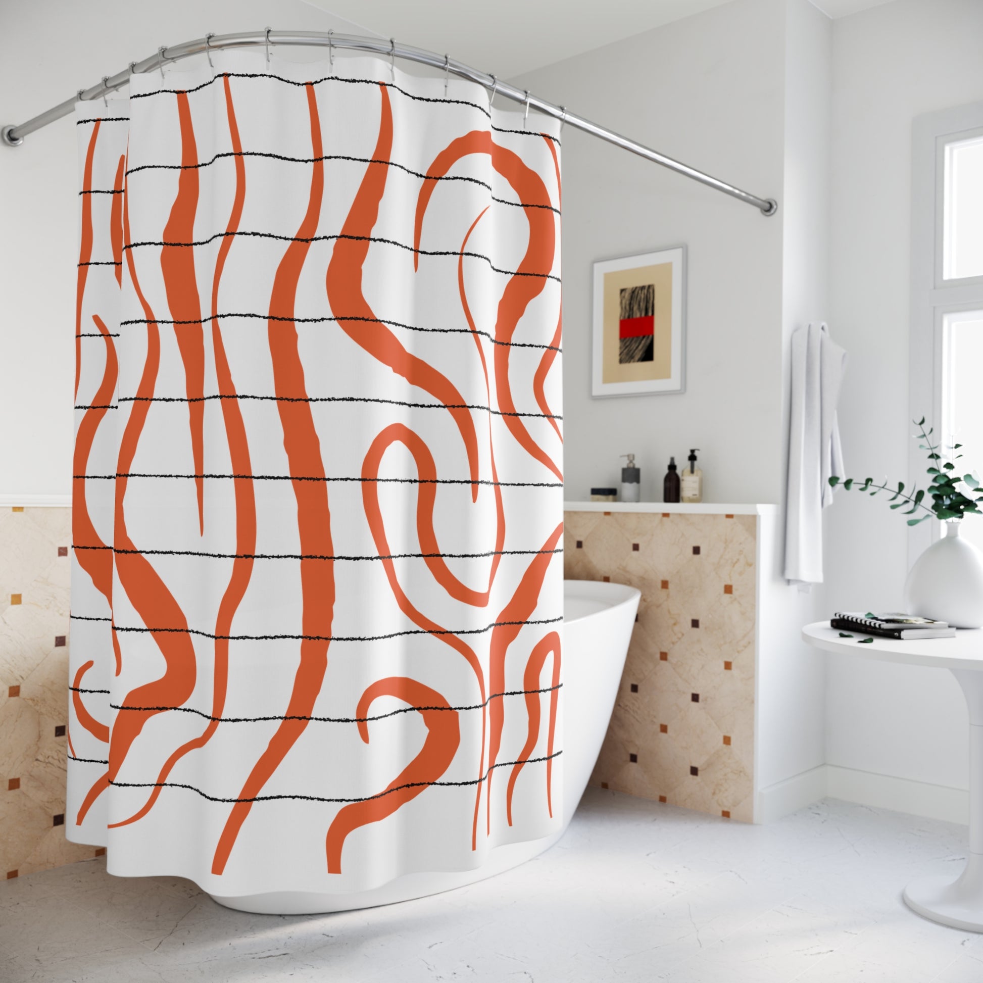 Unleash wild style with this abstract tiger-stripe shower curtain in bold orange and black. Curvy, claw-like lines ripple across the surface, giving your bathroom an energetic, primal vibe. Perfect for animal print lovers, eclectic interiors, or those looking to add fierce flair to their space.
