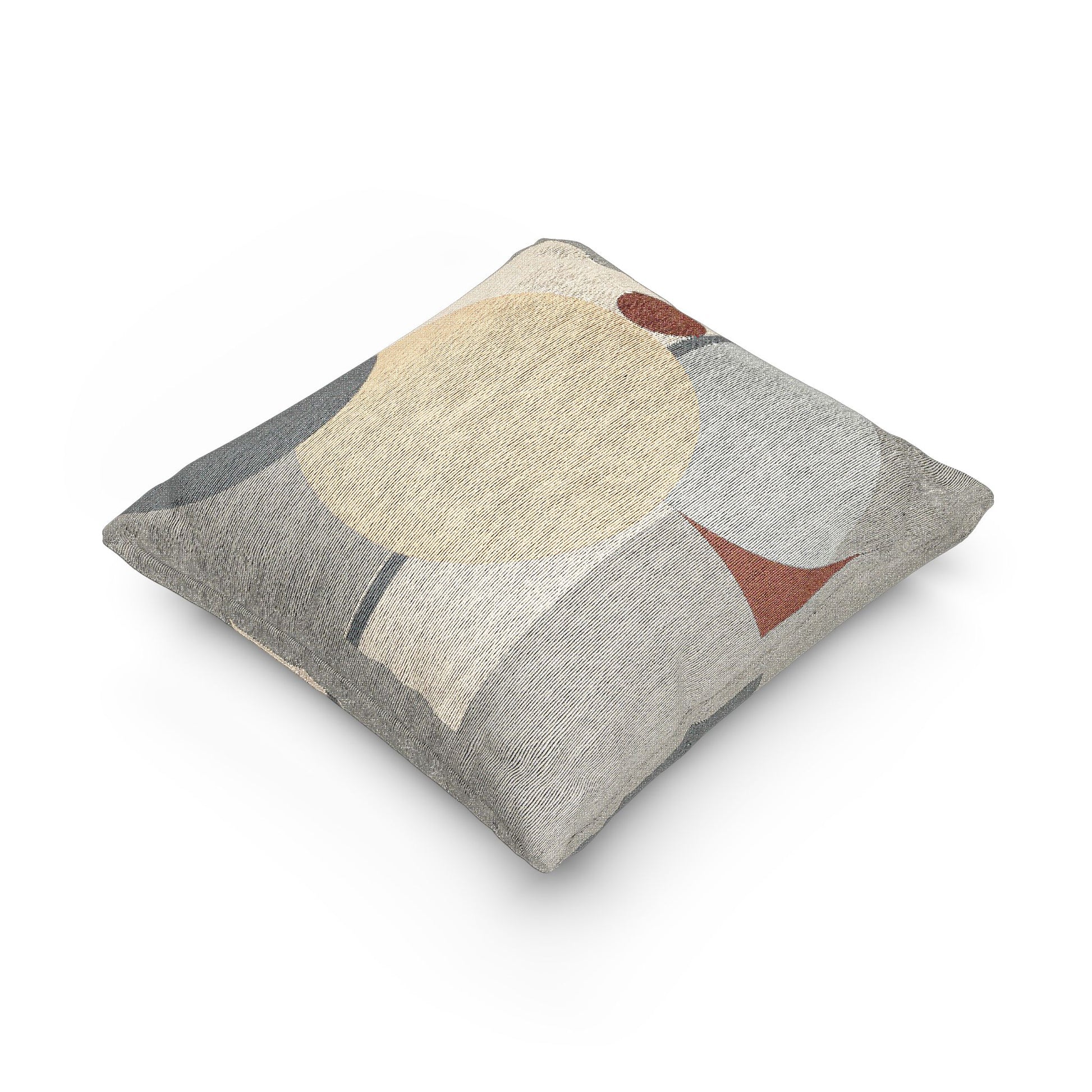 Add a sense of quiet balance and layered elegance to your space with this woven throw pillow featuring a composition of overlapping circles, squares, and stripes in muted tones. A central peach-colored circle anchors the design, intersected by maroon, gray, and off-white shapes that evoke symmetry and spatial tension. Vertical and quarter-circle accents add rhythm and structure, creating a modernist composition that feels both architectural and serene.
