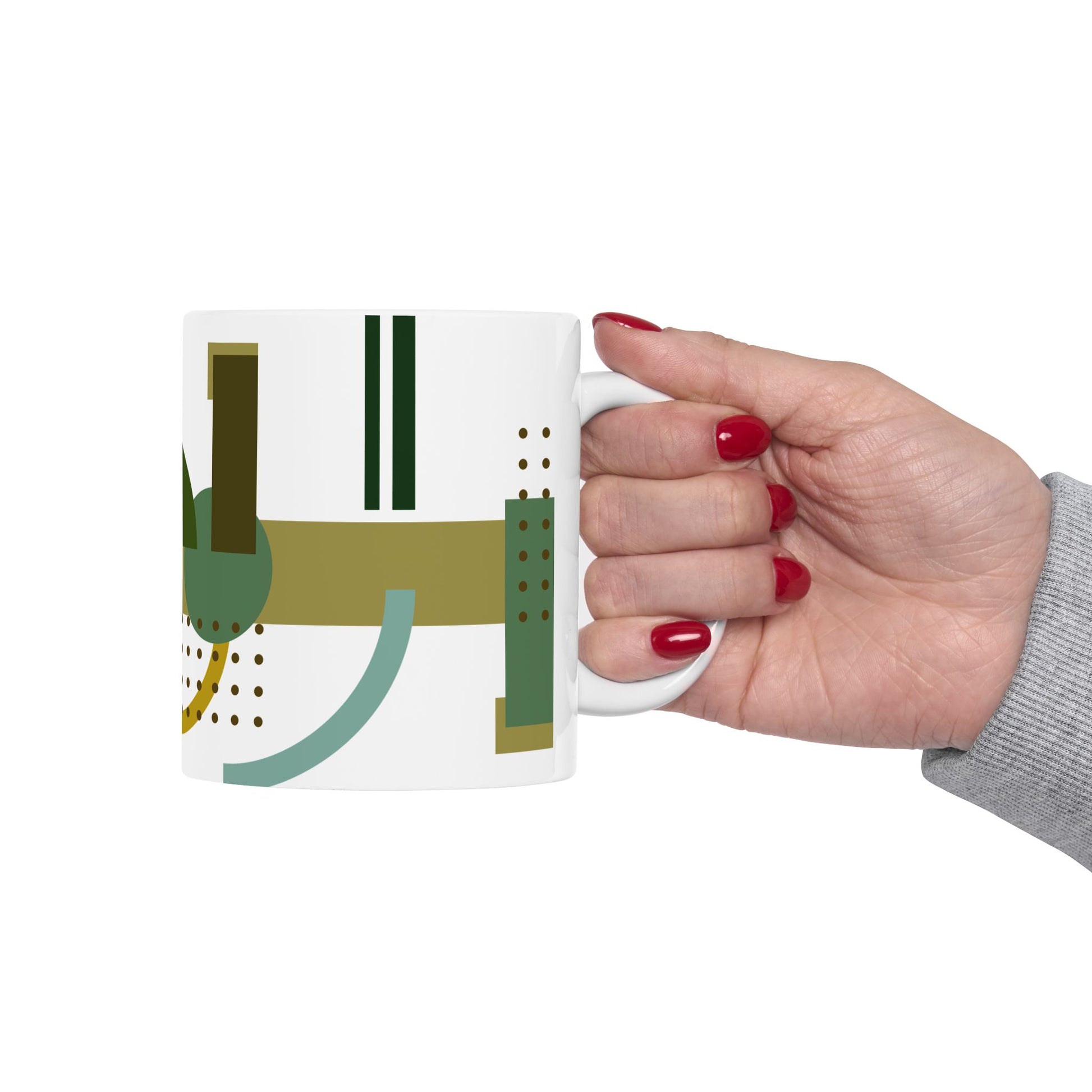 Dynamic Geometric Abstract Coffee Mug | Earthy Green & Gold Art Mug | Modern Curated Kitchenware | 11 oz Mug