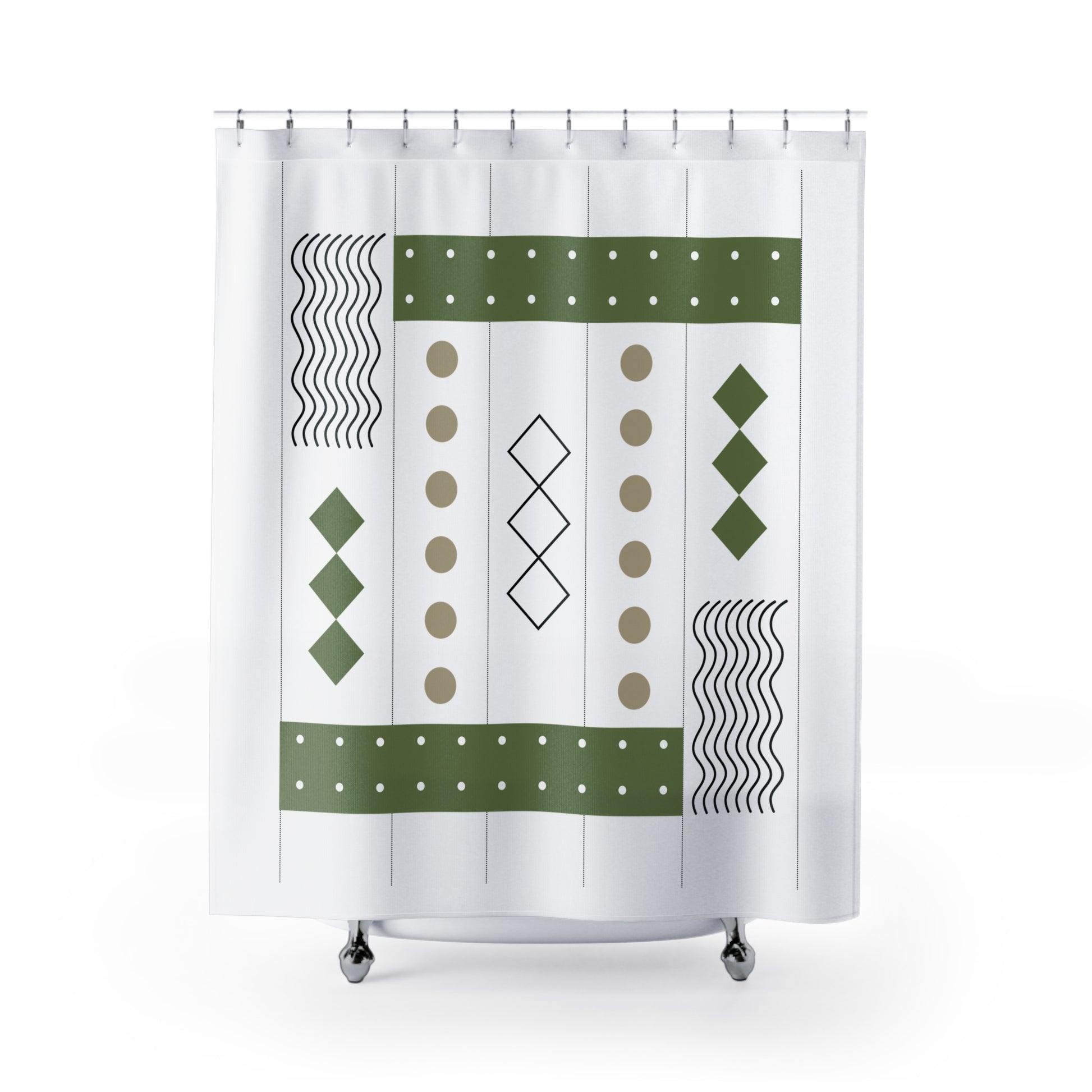 Refresh your bathroom with this balanced, earthy shower curtain featuring olive green rectangles, taupe dots, and soft diamonds arranged in a calm geometric layout. Subtle wave lines and a black background add contrast and elegance—ideal for mid-century modern, natural, or contemporary interior styles.