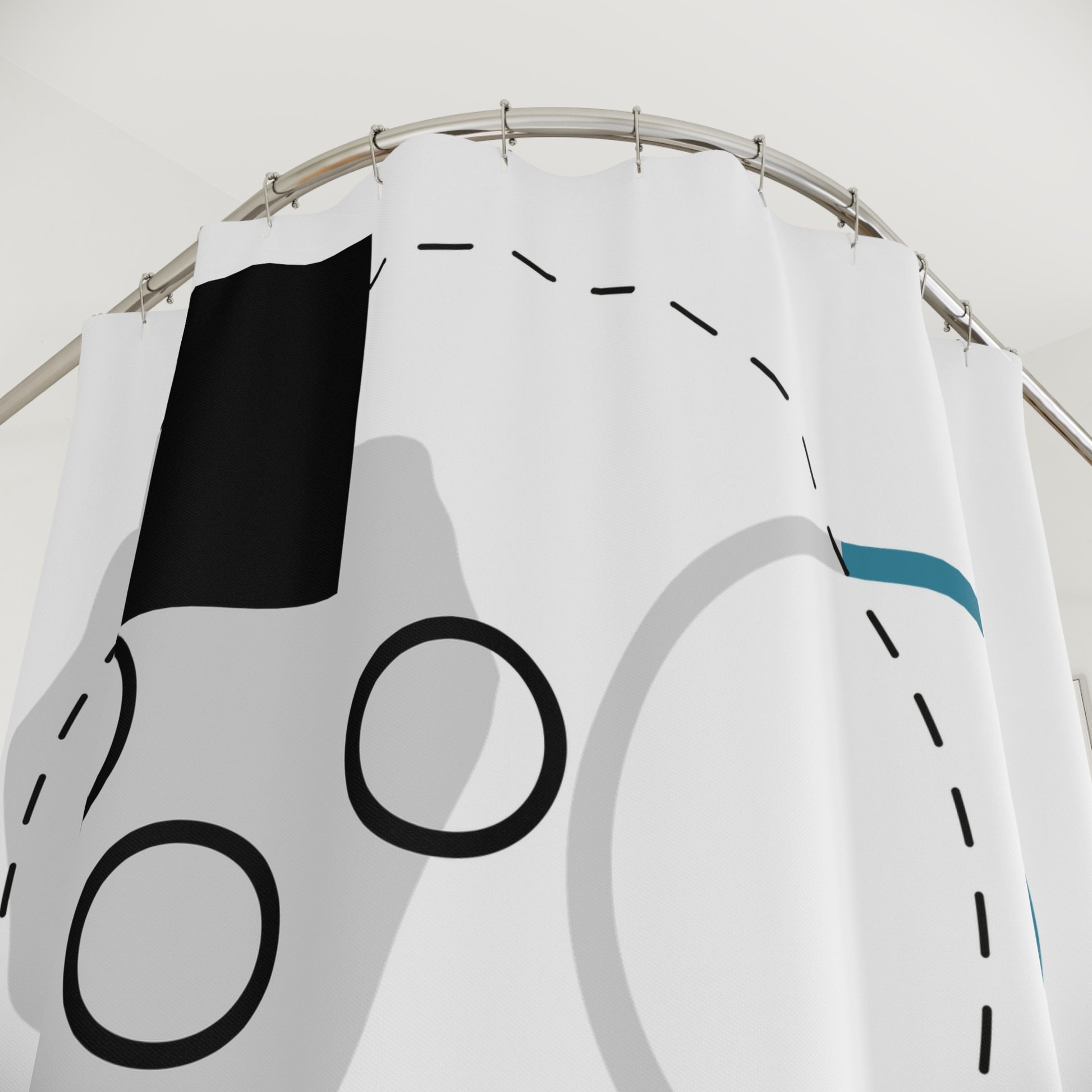 Transform your bathroom into a modern observatory with this abstract, space-inspired shower curtain. Featuring a cratered gray form, a segmented teal and white ring, and radiating circular motifs, this design feels like a cross between a lunar diagram and a futuristic interface. Perfect for fans of modern art, science, or cosmic aesthetics.