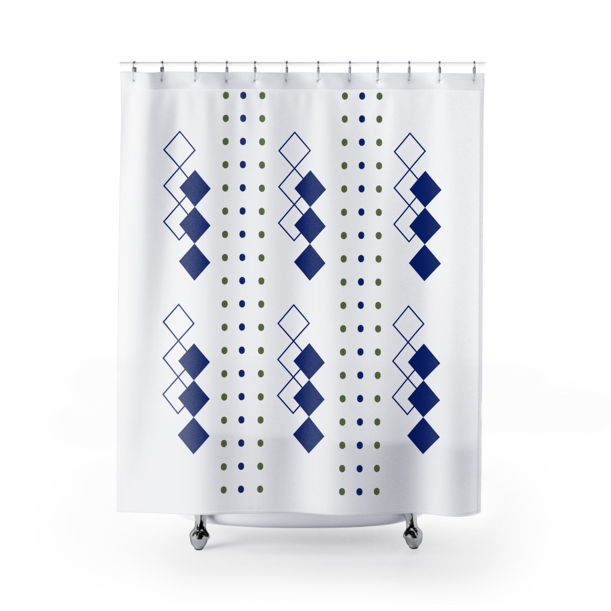Geometric Column Shower Curtain – Navy Blue & Olive Dotted Diamond Pattern