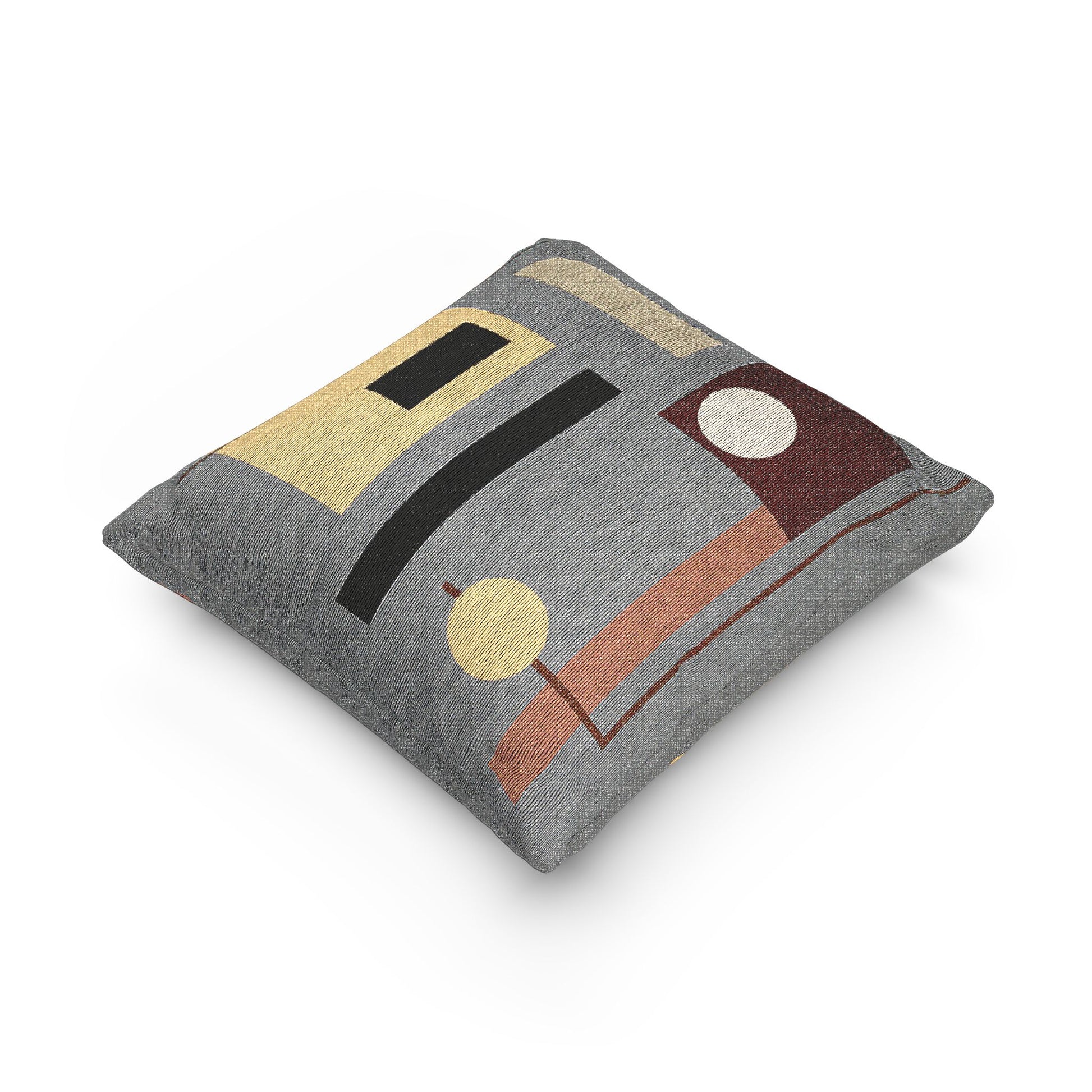 Add bold structure and layered contrast to your space with this woven throw pillow featuring a dynamic composition of intersecting shapes and earthy tones. A vertical brown bar and mustard yellow rectangle anchor the left side, while a horizontal beige block and orange-brown column create visual tension across the right. A mustard circle and white dot add rhythm and focal points, framed by crisp lines and geometric balance.