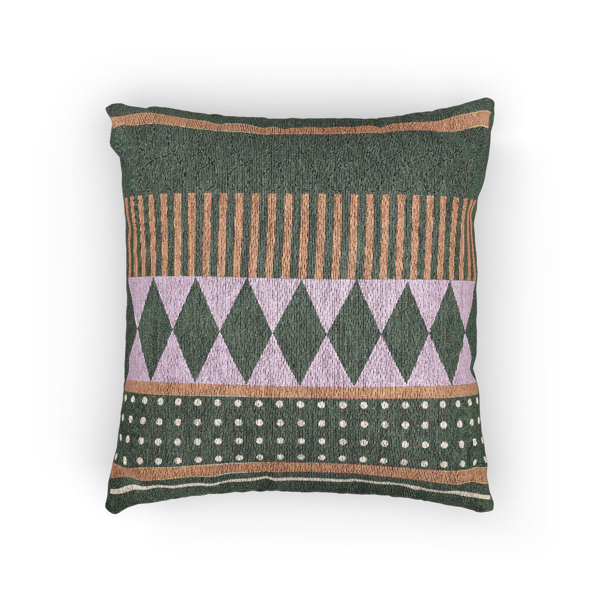 Where geometry meets theater—this woven throw pillow is a study in pattern and poise. With its stacked bands of interlocking loops, striped columns, diamond fields, and polka-dot flair, it's a tactile storyboard for a room that dares to be bold.