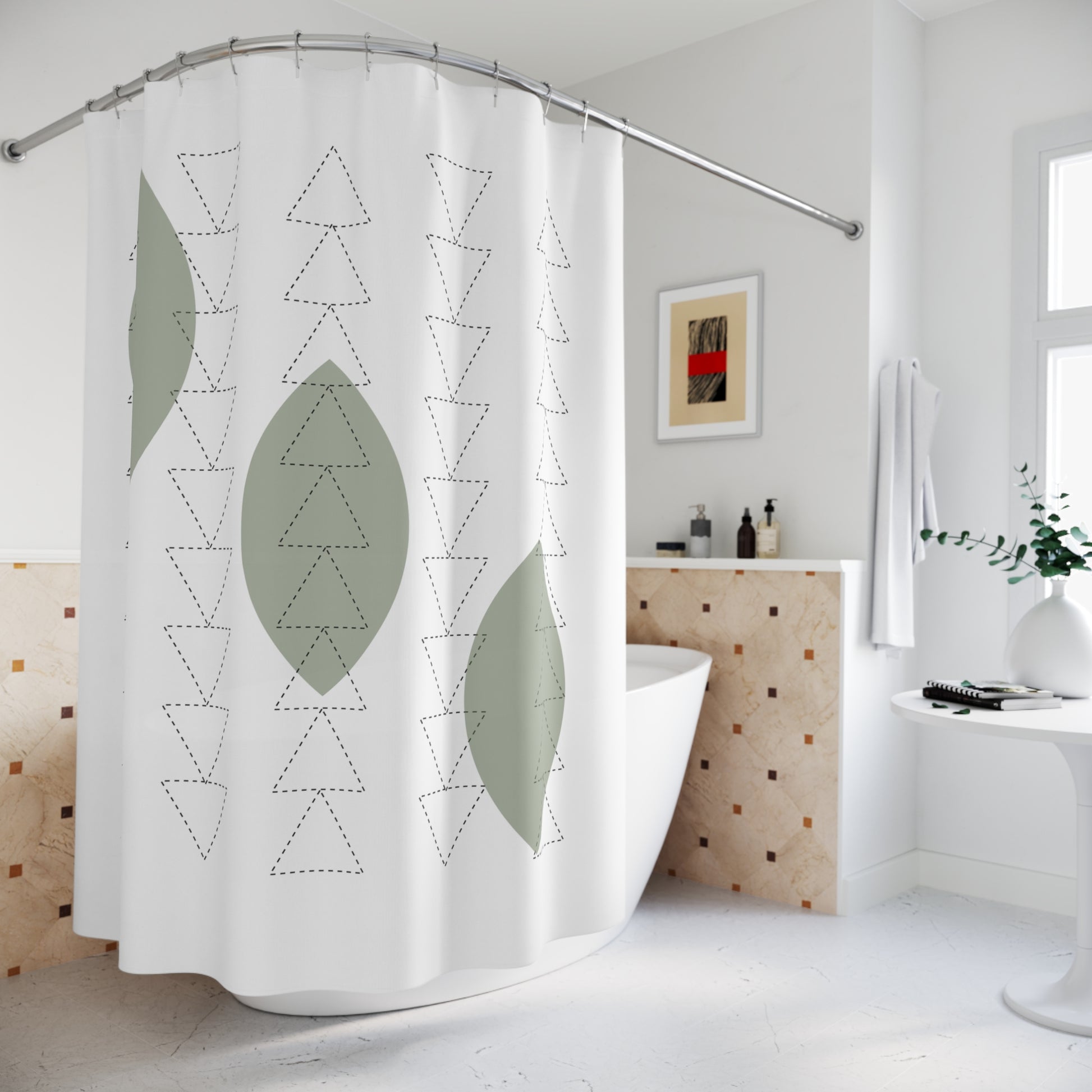 Minimalist Botanical Shower Curtain – Olive Green Leaves & Triangle Texture