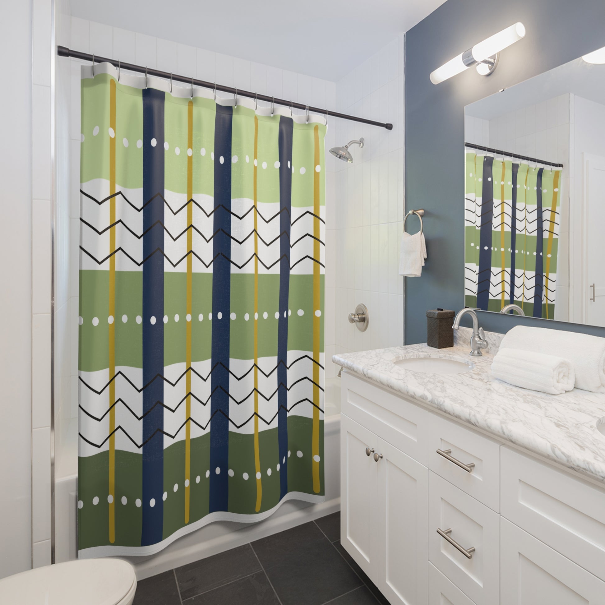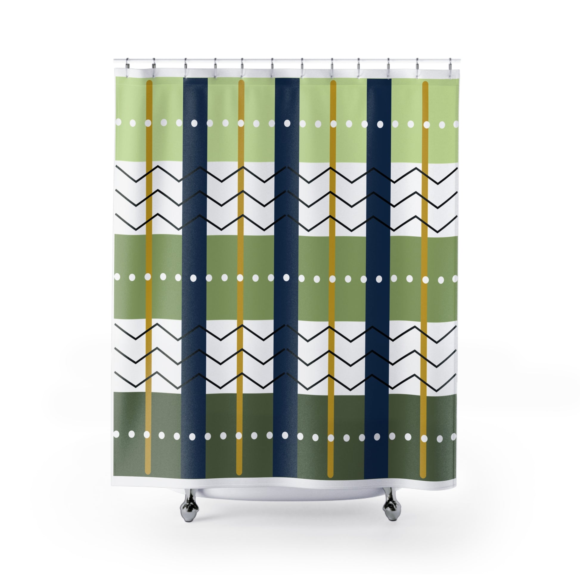 Redefine plaid with this bold, modern shower curtain featuring a striking grid of navy blue, olive green, and golden yellow verticals intersected by dotted white lines and arrow motifs. A unique twist on a classic pattern, this design brings structured elegance to both rustic and contemporary bathrooms.