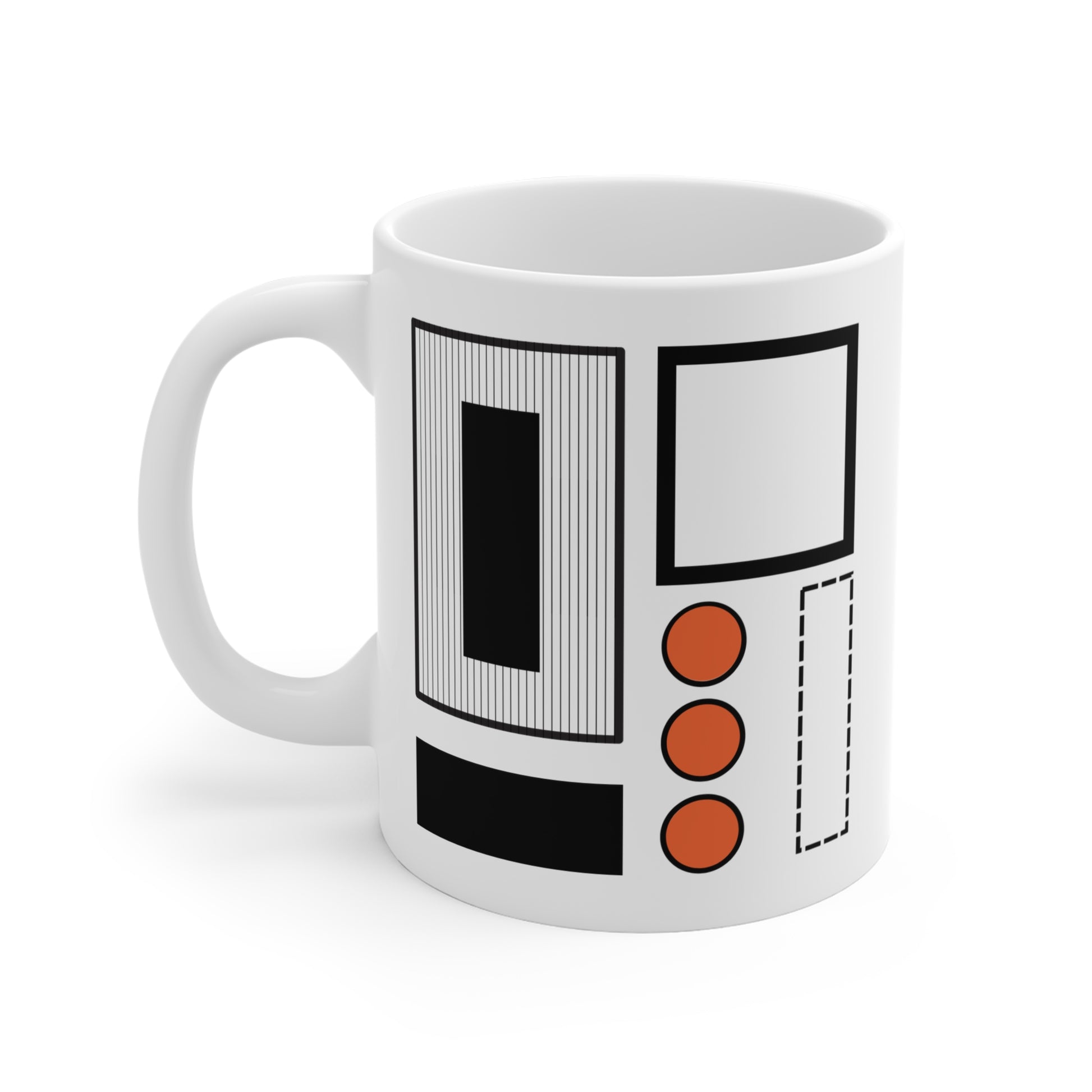 Bring bold balance to your morning routine with this 11oz ceramic mug featuring a minimalist composition of three vivid orange dots aligned beside a sleek black frame. This abstract design, created by an architect, plays with symmetry, color contrast, and negative space—perfect for modern design lovers and creatives alike.