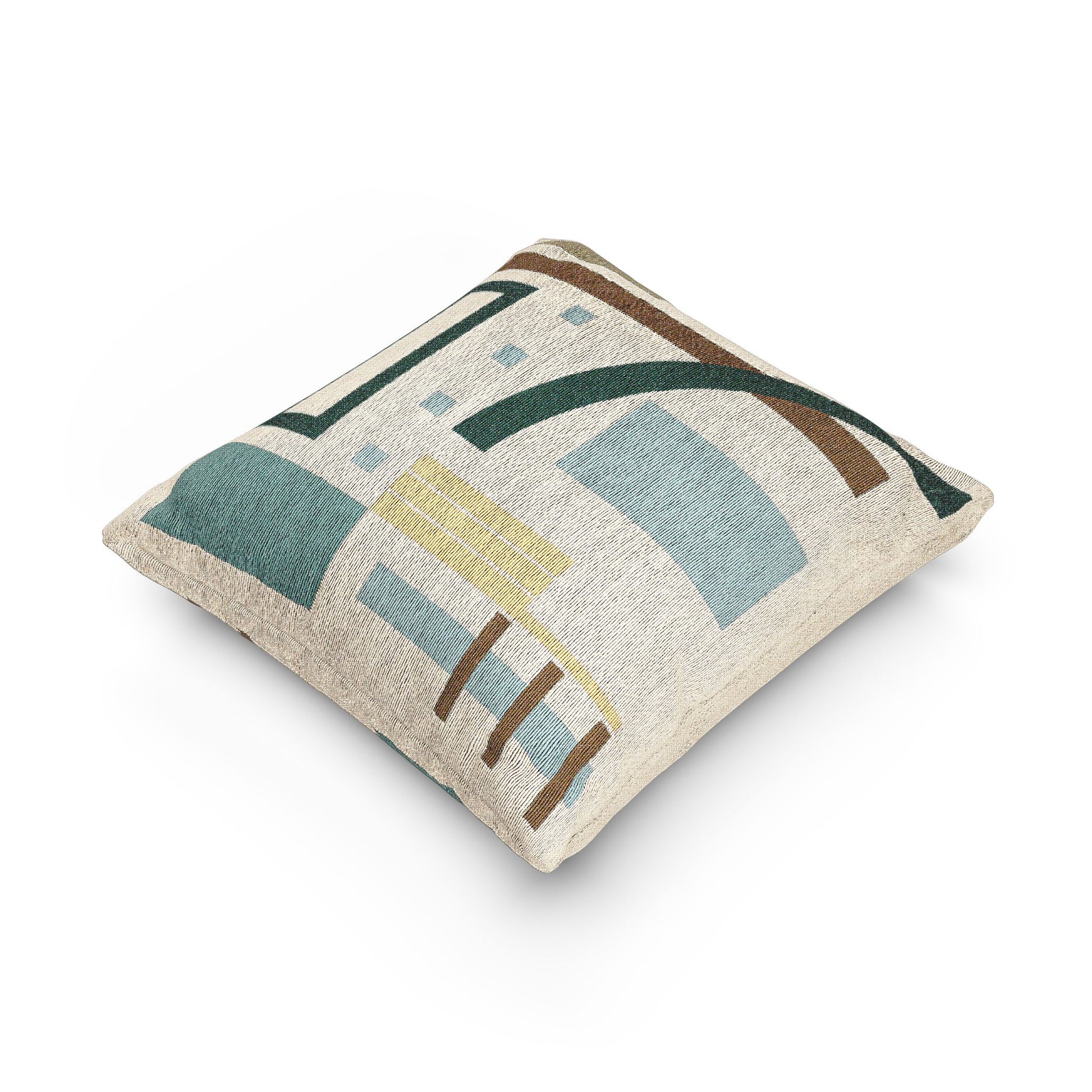 Add architectural rhythm and layered color to your space with this woven throw pillow featuring a bold composition of geometric shapes. Mustard yellow and brown horizontal blocks anchor the top, while teal arcs and rectangles sweep across the lower half. Light blue squares and rectangles punctuate the layout, adding contrast and visual texture. The design evokes a stylized landscape or modernist city grid, blending structure with abstraction.