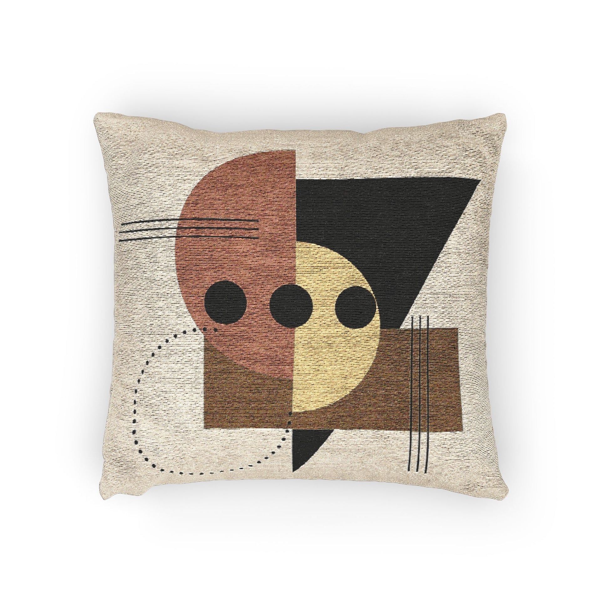 Add sculptural intrigue to your space with this woven throw pillow featuring a vertically stacked composition of geometric forms in earthy hues. A central olive green rectangle anchors the design, accented by three horizontal black lines. Flanking it are two semicircles—one in mustard yellow, the other in reddish-brown—each adorned with vertical rows of black dots and subtle linework that evoke symbolic or totemic motifs.