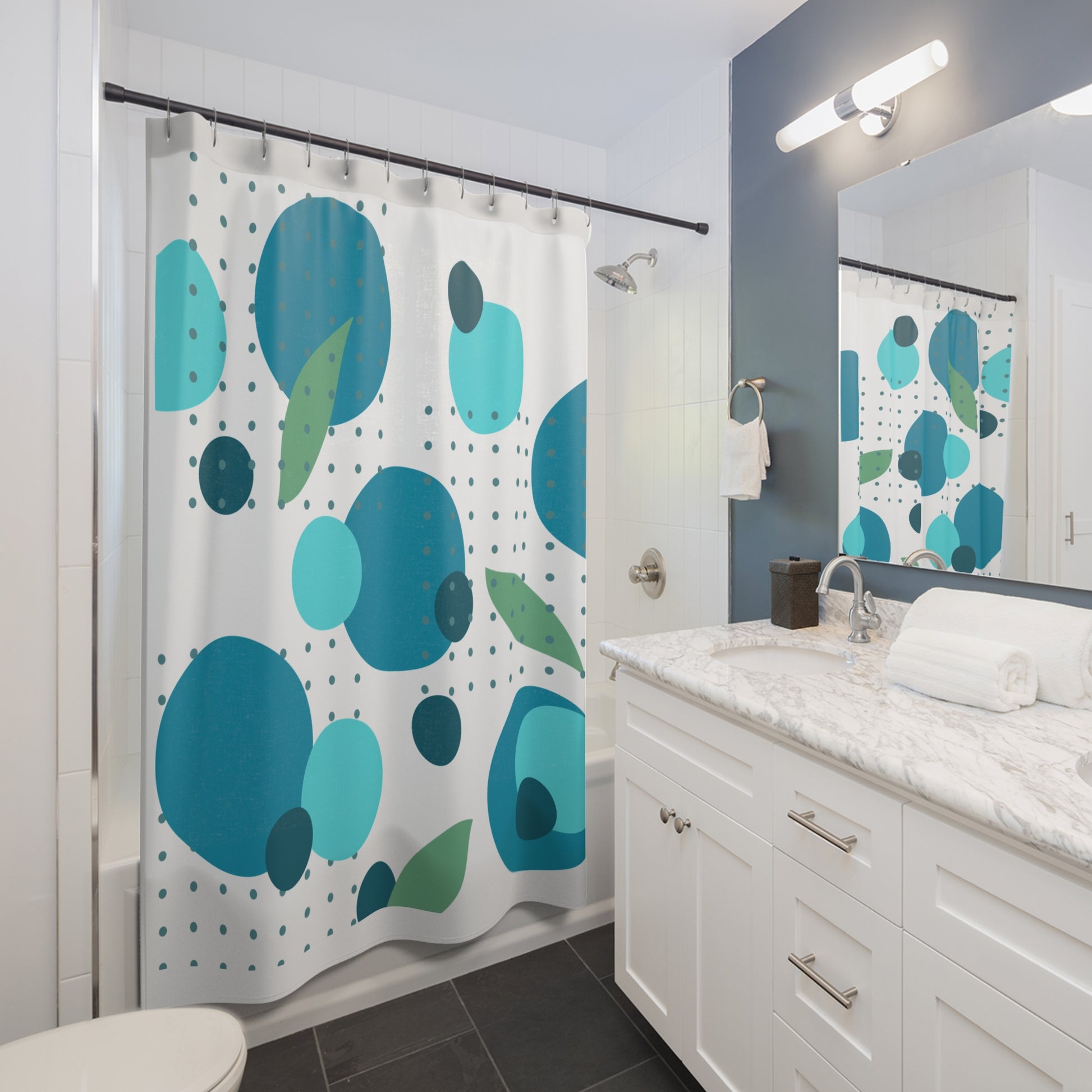 Freshen up your bathroom with this vibrant and playful bubble-patterned shower curtain. Featuring layers of overlapping aqua and teal circles, dotted textures, and soft green leaves, this design brings a light and whimsical underwater or botanical vibe. Perfect for a spa-inspired, modern, or nature-themed bathroom.