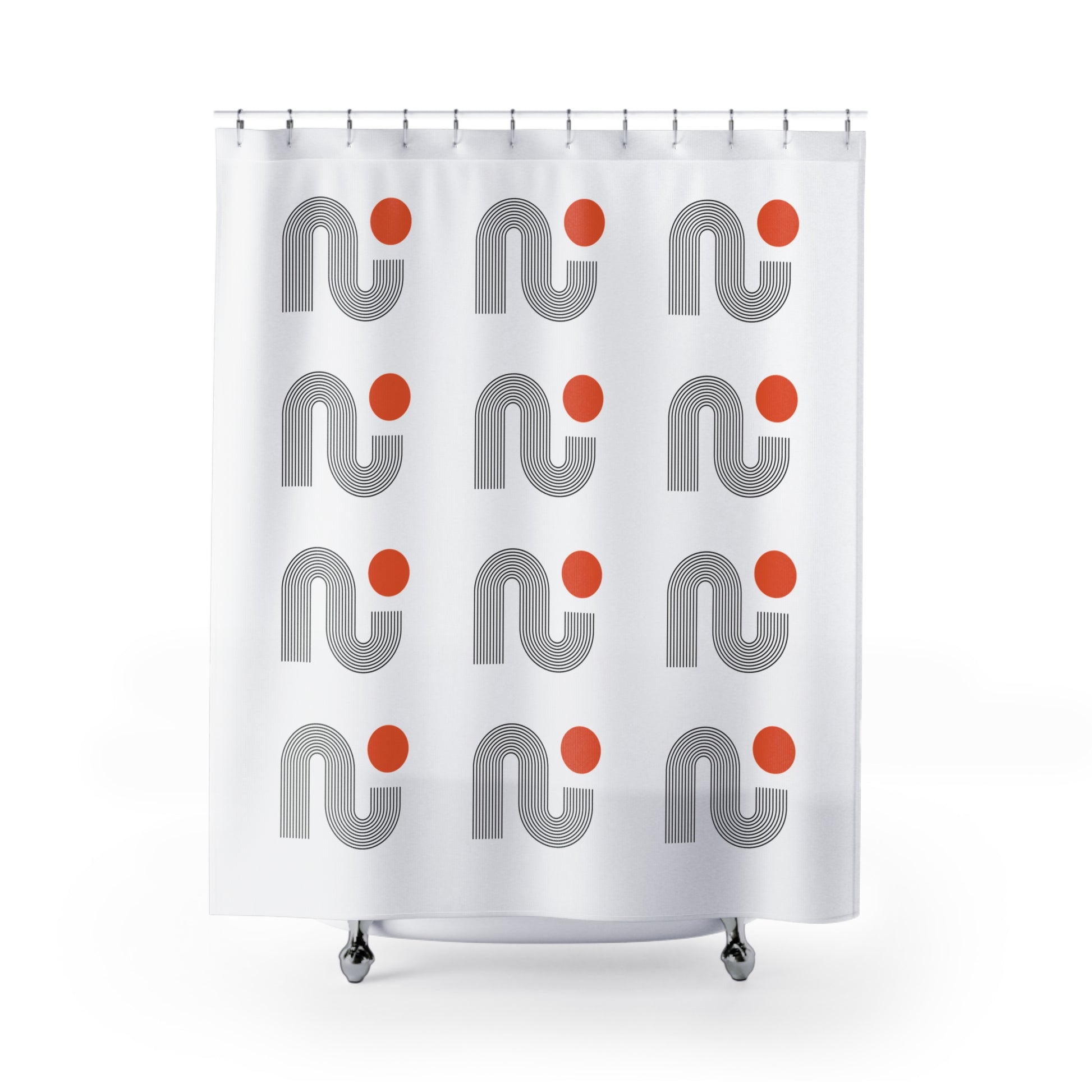 Elevate your bathroom with a sleek retro vibe using this repeating motif shower curtain. Featuring a stylized arc-and-dot design in matte black with a bold orange circle, this pattern blends mid-century curves with modern minimalism—perfect for artful, bold, or contemporary spaces.