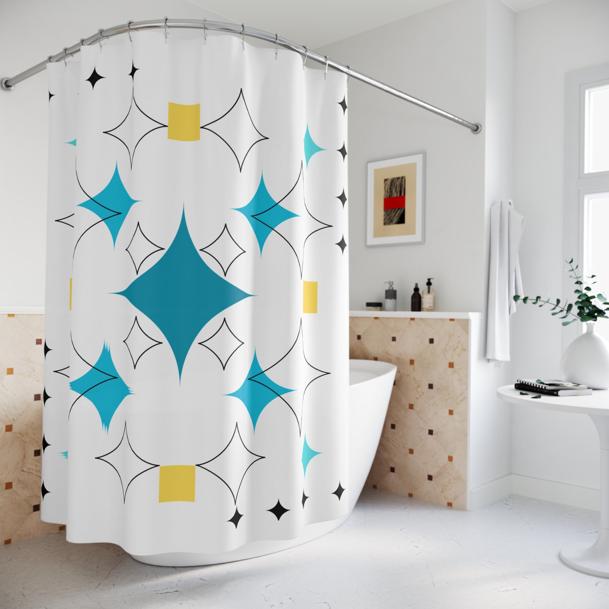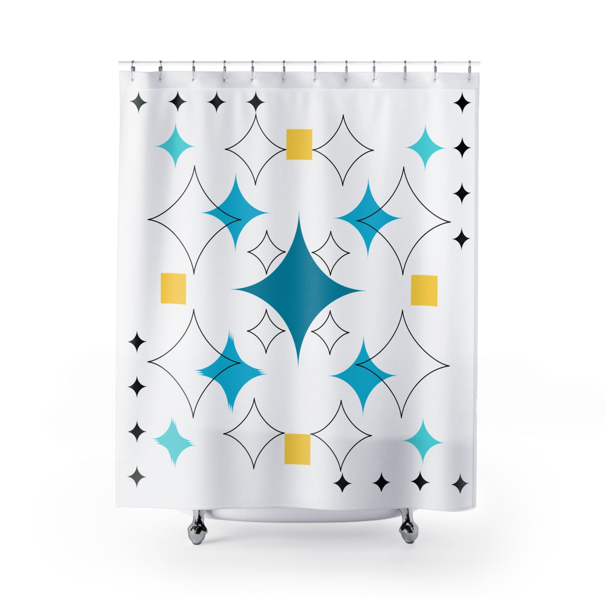 Retro Starburst Shower Curtain – Teal, Yellow & Black Mid-Century Pop