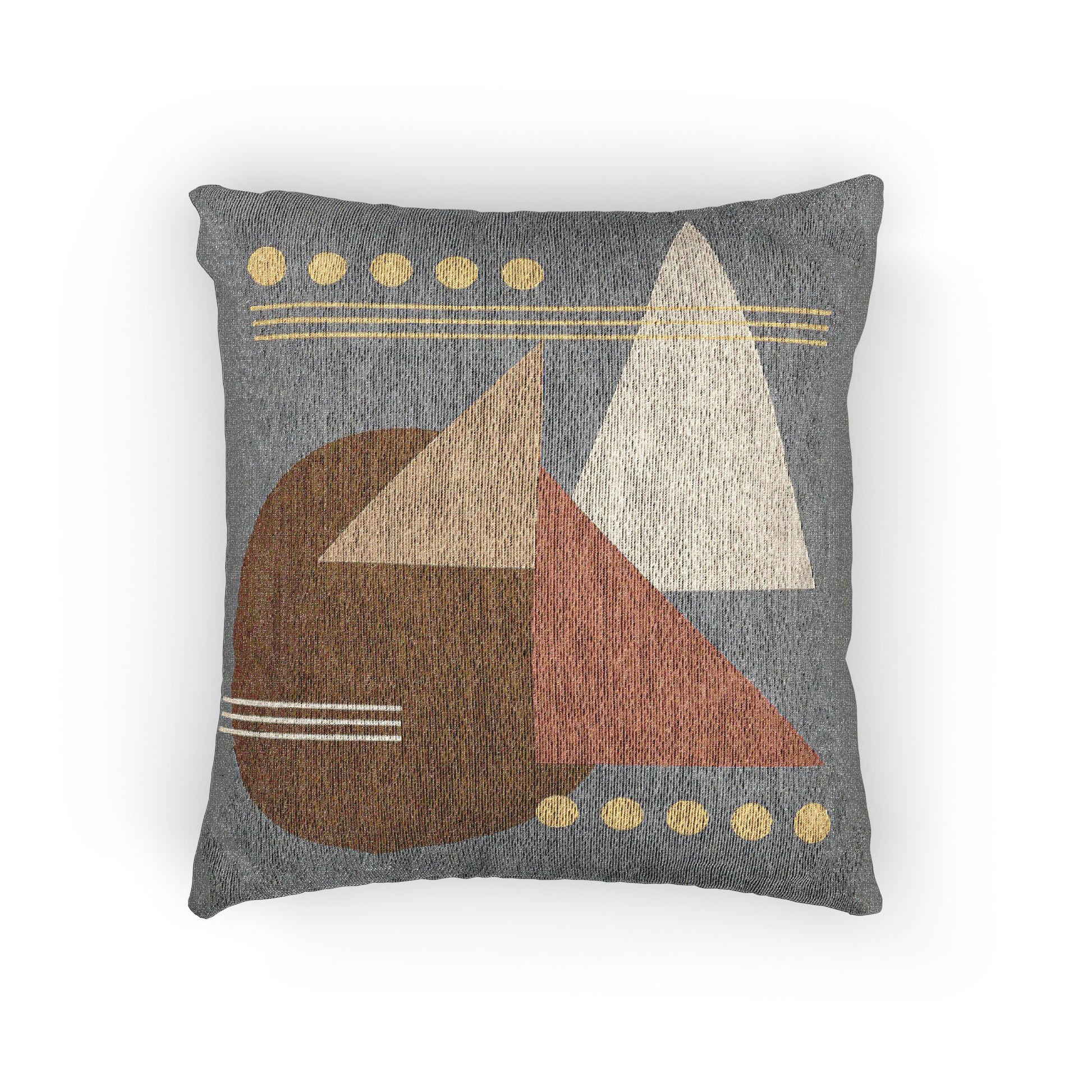 Add kinetic energy and layered rhythm to your space with this woven throw pillow featuring a dynamic composition of geometric shapes. A large olive-green circle anchors the bottom left, intersected by white parallel lines, while a trio of overlapping triangles—beige, brown, and orange—create directional tension across the design. Rows of yellow dots and horizontal accents evoke a sense of signal, motion, and modular harmony.
