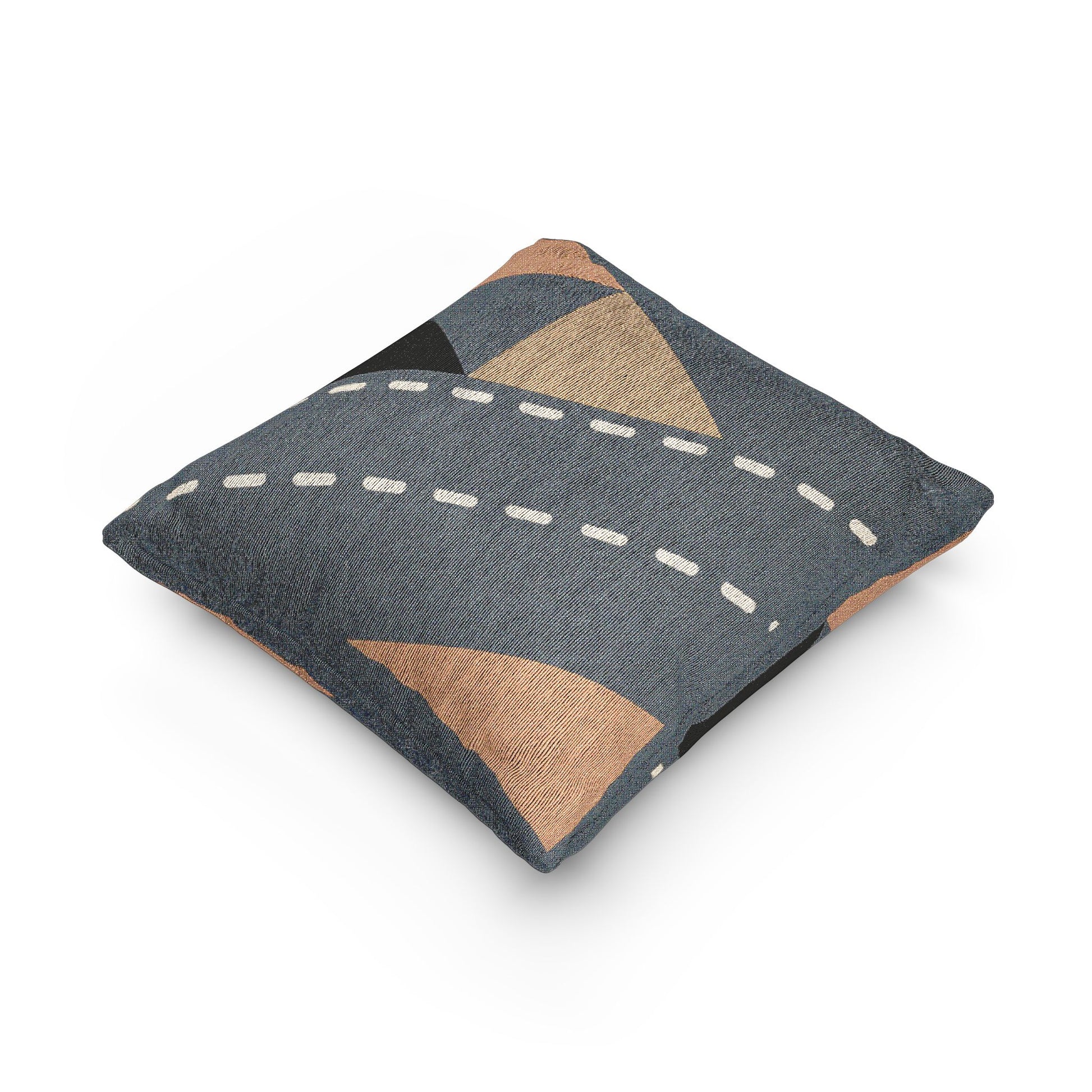Add a sense of direction and modern edge to your space with this abstract throw pillow, inspired by the intersection of design and motion. A diagonal road slices through a landscape of bold triangles and rich color blocks, creating a composition that feels both grounded and dynamic.
