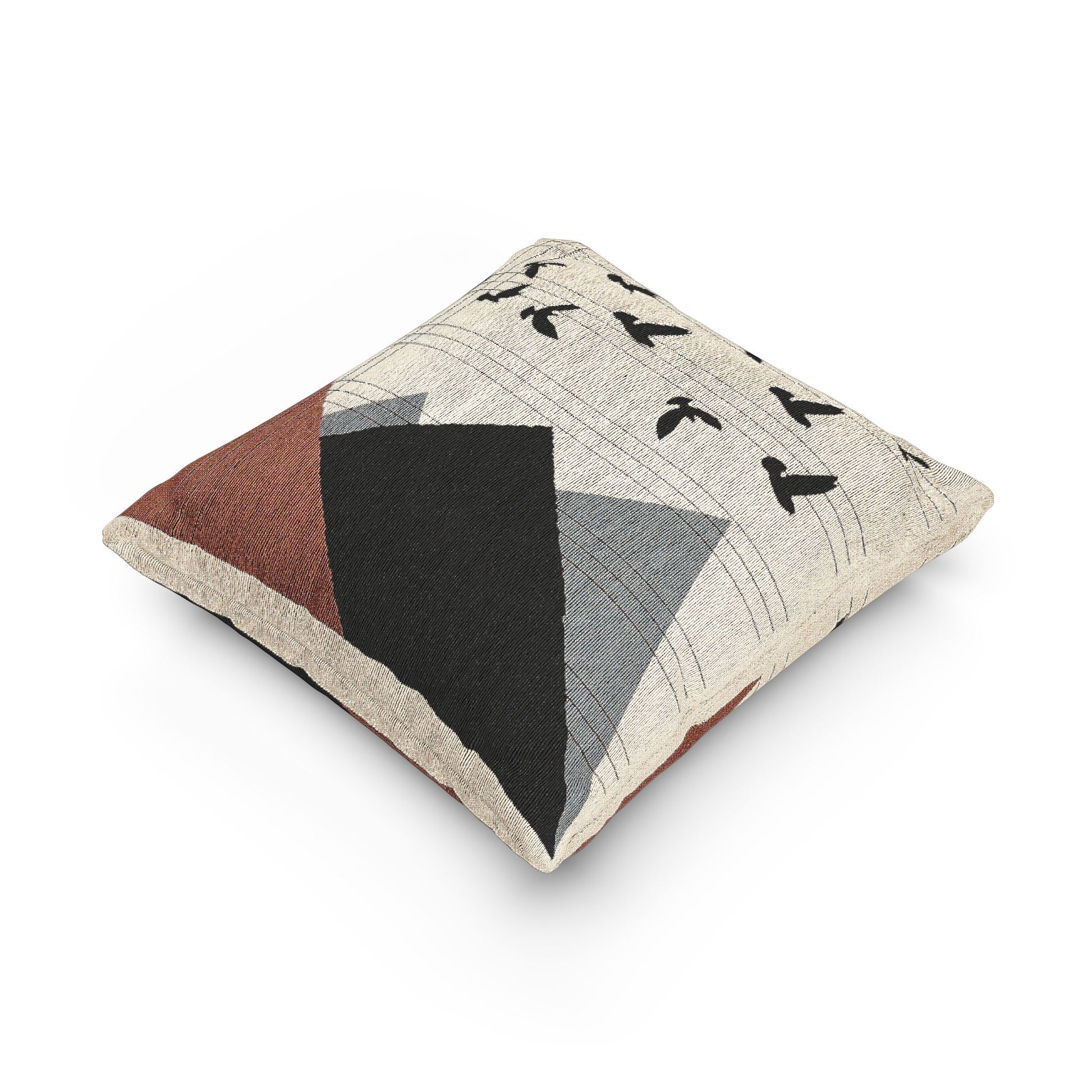 Bring sculptural calm and stark beauty to your space with “Trio Peaks,” a woven throw pillow that reimagines a mountain range through minimalist geometry and bold color blocking. Three stylized triangles, each a distinct peak, evoke terrain, time, and contrast—like nature told through design.