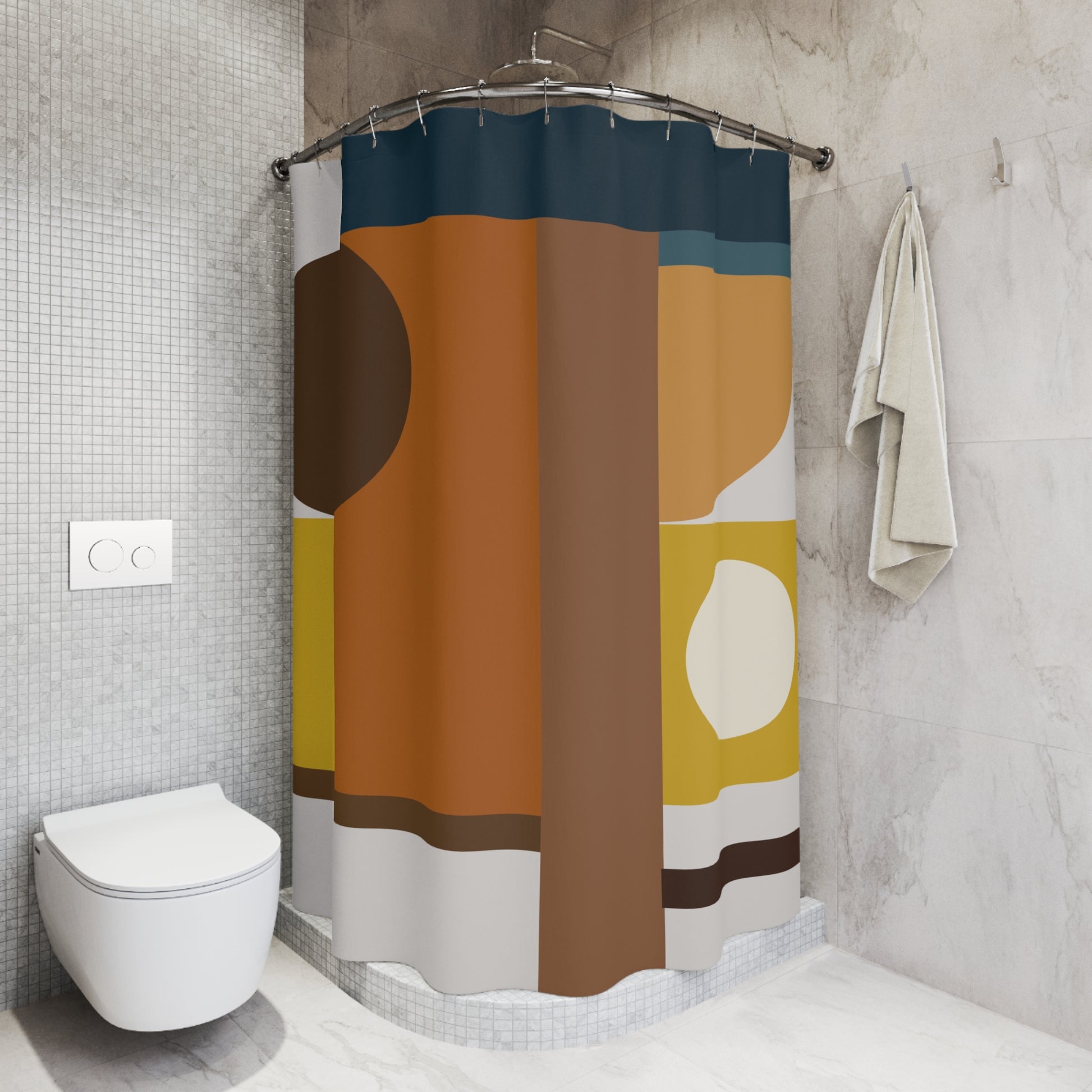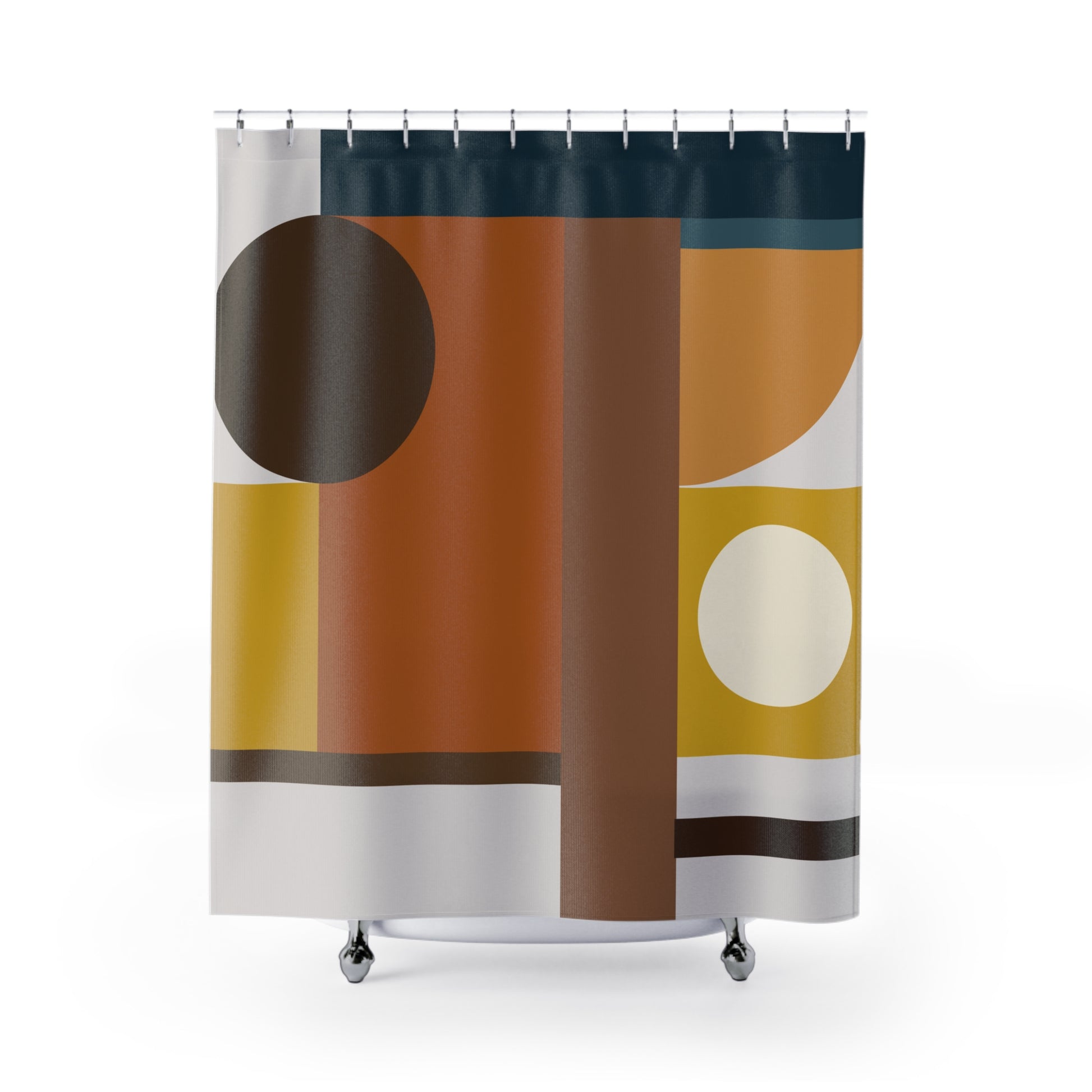 Transform your bathroom into a modern art exhibition with this captivating Warm Geometric Block Shower Curtain. The design features a bold, multi-layered composition of large squares, rectangles, and circles, executed in a rich, inviting palette. Inspired by Bauhaus structure and the warm tones of Mid-Century Modern design, this curtain is a powerful piece of functional art that instantly elevates your space.