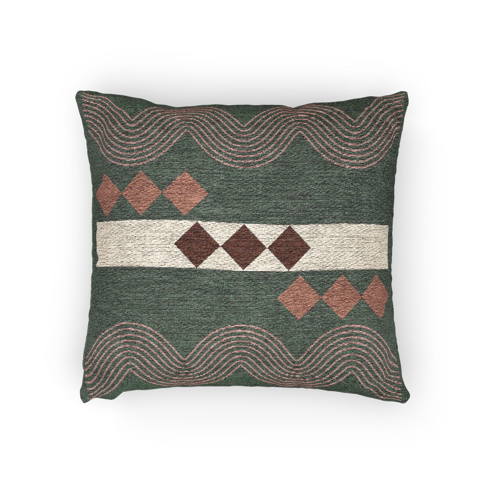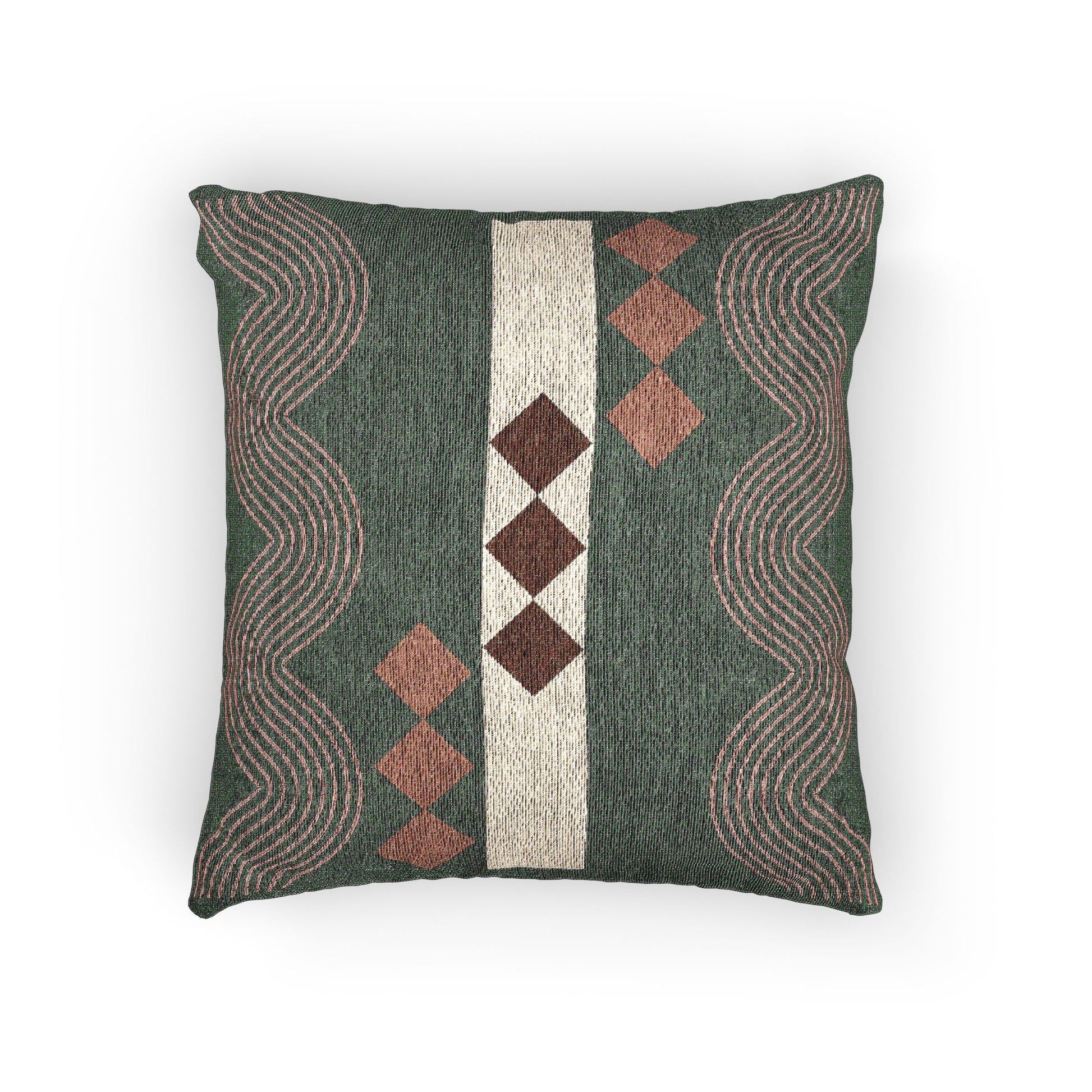 Strike a perfect chord of rhythm and geometry. This throw pillow features a striking vertical cream-colored spine running through a black canvas, punctuated by a vertical series of brown diamonds—mirrored subtly on either side like echoes or footnotes. Flanking this visual axis are wave-like line patterns that ripple with understated energy, creating a sense of movement and symmetry.